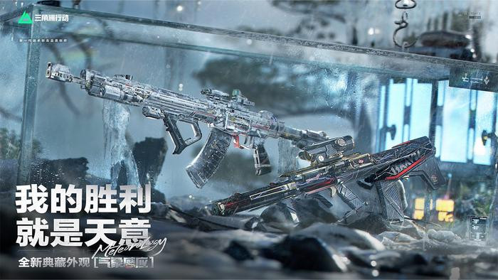 全新典藏外观-气象感应,包含AUG突击步枪和腾龙突击步枪。武器外观设计融合了极寒、炎热、酸雨、雷暴四种特殊气象设定,可在检视时展示独特气象变化效果。同时,击败敌人后会提升特效强度,并搭载了检视语音及专属曳光弹设计。