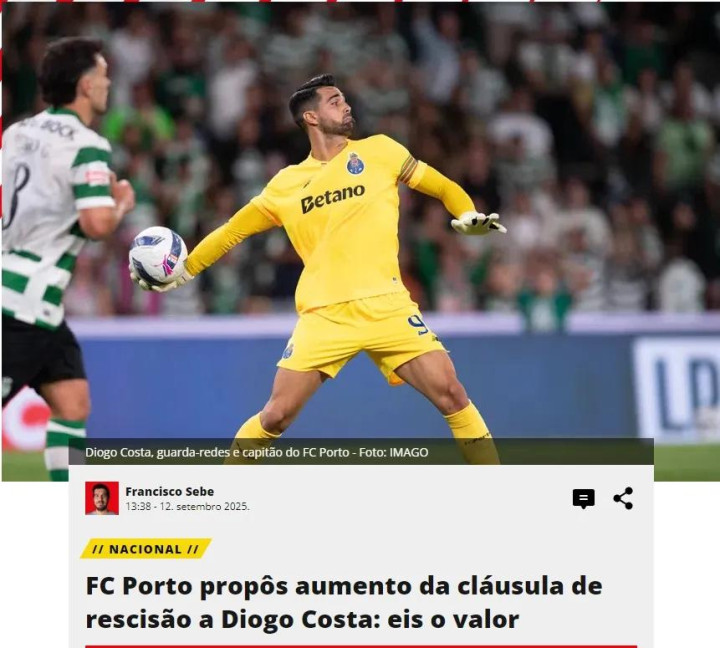 葡媒球报消息,波尔图已经为迪奥戈-科斯塔提供了一份新合同,这名门将的违约金将从7500万欧元上涨到1亿欧元,并且他将成为波尔图队内的顶薪球员。