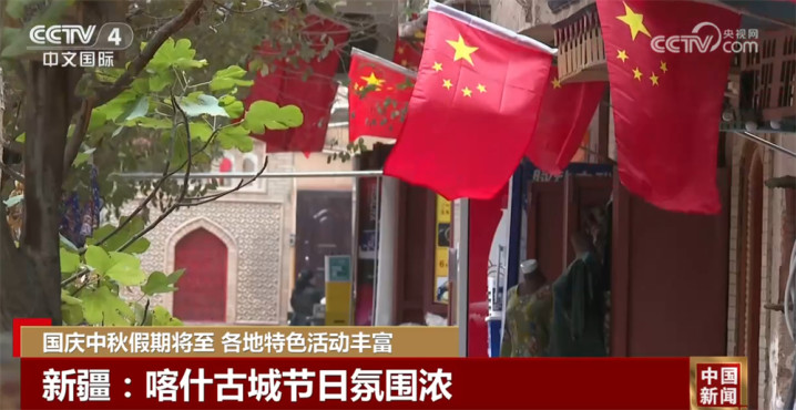在新疆喀什,国庆节来临前,古城的街道上都挂满了鲜艳的五星红旗,让来自全国各地的游客们都感受到节日的喜庆氛围。