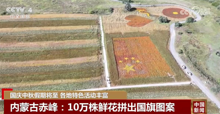 而在内蒙古赤峰市,克什克腾旗桦木沟景区300亩花海近日悄然绽放,其中,由10万株百日菊种成的一面“国旗”图案花海成为众多游客前来打卡拍照的景点。